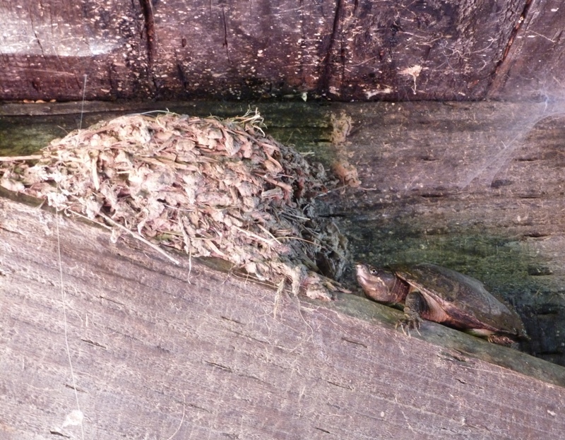 The forecast a couple days out called for clear, sunny skies. But the afternoon prior, that changed to 50% chance of rain. Bummer. The night before, Norma's interns, Julia, Jana, and Katharina, came over for dinner and spent the night. That made it easy for us to get an early start. I drove out extra early and picked up my friend Stacy and her Cayuga 130 Old Town kayak. She was having some car issues so she wasn't able to transport her boat on her own. The two of us made our way to the park where we were met by Norma and the interns. I invited three of my male co-workers to join me: Mike B., Mike D., and Wahab. I had no takers so it was just me and five good looking chicks. It rained on the drive out but it stopped by the time we arrived. I think this worked in our favor because it seems like for much of the time, we had the whole place to ourselves. I rented a Pelican Pursuit 100 kayak at the Boat House. They also rent bicycles there. There were several canoes and some kayaks that had seen better days. Most were missing a footwell. The one I picked had a broken hook eyelet which I deemed less important. I launched from the beach right next to the boat house (shown below) and then paddled across the Tuckahoe Lake to the boat ramp to meet up with everyone else. We got the gear unloaded and then I assigned everyone a boat. Julia had the most boating experience of the interns so I put her in the Pelican which required a little more effort than the others to go straight. Jana was in my Prijon Catalina because she is petite and wore a red hat. Katharina wore a blue hat so she got my Cobra Expedition. That left Norma and me in the tandem which worked out good because she likes to take photos while I do the work. The last time I did this trip was June 15, 2013. Based on my previous experiences, I promised folks that they would see a plethora of turtles. I would have to eat my words if that was not the case today. The six of us paddled along the north side of the lake heading clockwise. Eventually we found a small opening that we paddled into. Things were looking lush and green. I usually took the lead with Jana or Katharina right behind. The small opening ended up being a dead end so we made our way out and then found the main part of Tuckahoe Creek. We saw three beaver lodges but no beavers. Numerous swamp hibiscii (aka swamp mallows) were in bloom. There were other things in bloom too like buttonbush and lizard's tail. One plant that I saw that I don't remember seeing previously in the area was dodder. Stacy identified several birds and told us about their calls. We paddled upstream on the creek. Unlike the section just below the dam, this area was a bit more open with no downfalls or portages. I'm guessing that has something to do with the fact that it is used so much. On a nice day, the place can be really packed but not this morning. Heading upstream, the only other boats we saw were owned by two fishermen. Julia had the most challenging boat. Stacy eventually swapped boats with her and then I paddled the Pelican on the way back while Julia rode in the tandem with Norma. There were quite a few eastern painted turtles on the logs. As the day warmed up and the sun came out, we saw more. I estimate I saw between 50 and 100 that day! While we saw no beavers, we did see evidence of activity. My term for this is "beaverchew" (see below). Can you see the individual tooth marks? The trunk of this tree was about 14 inches in diameter and the tree stood about 30 feet tall, leaning on another tree. I'm guessing the beaver was hoping to use this to start a dam but gave up when it didn't fall all the way across the creek. I was having a superfantastic day and so was Norma. Eventually, we reached our destination, the park campground loop. Here, we got out, used the campground facilities, and found an open table where we ate lunch. By now, the haze had cleared up and sun was shining brightly so some shade was much appreciated. We paddled back downstream. The current gave us a gentle push and directed us where to go. Without as much need for a leader, I spent more time in the back. Jana saw a muskrat. Back on the lake, I paddled to the boat house where I returned the Pelican kayak. I was out a half hour longer than expected (I paid for four hours) but I was not penalized. I walked back to the ramp where the rest of the group launched while they paddled across the lake. Norma led the other ladies up the narrow Blackiston Branch for a short distance. This involved kayaking under Crouse Mill Road where there were several swallow nests. There was also a turtle with three nostrils resting on a support beam under the bridge. It didn't look like the other turtles we had seen earlier. I wondered if it was a carnivore and possibly eating the baby swallows. The last time I was there, I saw a different turtle in almost the same location (see June 15, 2013 turtle). A few days later, Stacy identified it as a musk turtle. They are omnivorous (e.g., seeds, insects, snails, tadpoles, algae) and will occasionally scavenge on fish carrion. This species rarely emerges to bask and is most successfully captured with nocturnal trapping techniques. Musk turtles climb surprisingly well and occasionally rest fairly high in trees. - from "Savannah River Ecology Laboratory - Common Musk Turtle (Sternotherus odoratus)" (broken link as of 2026) Having completed a very casual five miles, we loaded up the boats and then headed out. Our next stop was Adkins Arboretum. We changed clothes then explored the trails on the shaded east side. We saw paw paw, sassafras, tulip poplar, and hickory trees. Some wild berries were ripe and just asking to be eaten so I obliged. A couple of rabbits ran amok. Next, we drove to the aviary at Tuckahoe State Park. The staff were showing various raptors. These birds were injured and would not survive in the wild. I saw these same raptors earlier this year on March 14, 2015 and April 26, 2015. We were invite