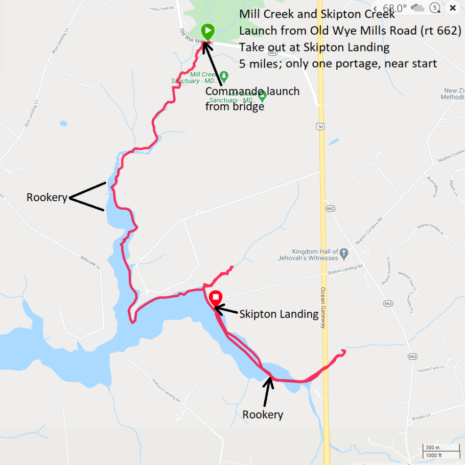 We did a car shuttle, placing one vehicle at Skipton Landing and the other on Old Wye Mills Road (route 662) where we did a commando launch under the bridge onto Mill Creek. I had never launched here before and didn't know what to expect in terms of downfalls. I brought a saw and loppers. I also brought a kayak instead of a SUP and I left Daphne at home. Soon after launching, we did a portage over a couple of fallen trees. But after that, everything was clear. I should have brought my SUP and Daphne. Here's Sara paddling downstream on Mill Creek. Paddling downstream, we noticed lots of skunk cabbage in bloom. We also spotted a muskrat mound and heard a barred owl. But the main reason we ventured out was to see the great blue heron rookeries. The first heron rookery we encountered was on Mill Creek at 38.897423, -76.081989. Here's Sara paddling her Necky Chatham 16. Herons weren't the only things we saw. There were also a few bald eagles out. We saw a second great blue heron rookery on Skipton Creek at 38.886069, -76.066713. It was nowhere near as impressive as the first. There were a lot of nests in this one particular tree but we didn't see them until the birds flew away. The best time to see either rookery is in the morning because then you'll have the sun on the east. Sara got a couple of snapshots of me. Thinking about our trip, I don't think it was worth it to launch where we did. It would have been better to just do an out and back from Skipton Landing rather than do a cumbersome launch and have to coordinate a car shuttle. Here's our route.