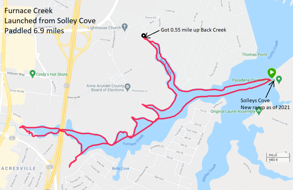 This was our first time putting in at the new Solleys Cove launch. We were very impressed with the new road, parking, ramp, porta-john, and beach. The place is now quite popular. I unloaded my SUP and found a dead bat under one of my bungees. I don't know how it got there. The last time I took it out was at Franklin Point State Park where I left a little after sunset. I'm guessing it got trapped and died on the drive home. Very sad. We made our way out to Back Creek, a very scenic and fairly natural creek. It is shown in this blog's cover photo. We also found a persimmon tree loaded with a lot of fruit. Unfortunately, it won't be ripe until after I've put away my watercraft for the season. Norma is interested in native (or at least non-invasive) plants that grow well in wet areas. So when she saw lots of swamp hibiscus plants with seed, she figured she'd take a few to grow in our yard. We know it is a good environment for them since they already flourish there. Here is one getting ready to expose its seeds. And here is one with seeds exposed. We saw a few bald eagles. One might not expect to see them so close to Baltimore City but I've seen quite a few in the area over the last several years. They like to hang out on the high voltage towers. The four of us paddled as far as we could upstream (west) on Furnace Creek before heading back. Here's Sara kayaking under Arundel Expressway (route 10). The north side of Furnace Creek is undeveloped, along with the western side of the south side. Sara took this picture of Norma, Daphne, and me on the latter. Heading home. The Rams Head is a local chain that used to have a restaurant in our town, Savage, Maryland. But they sold it about a year ago. As of late 2021, it has been replaced by the Dive Bar and Grille. They are pretty similar. Now if you want to find a Rams Head, you can simply paddle to the Rams Head Dockside on the south side of Furnace Creek. In the below photo, you can see it in the background. Just don't drink and paddle. Norma (the photographer) has Daphne's attention. It was a great day to get out on the water with two of my favorite people. Here is our route. ![]() |